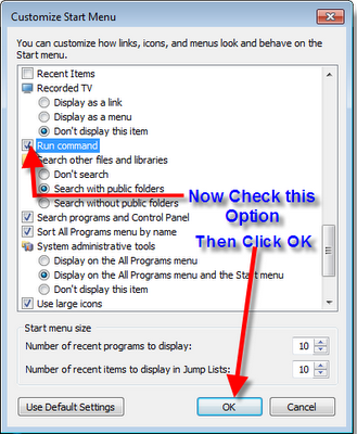 5.Click the Start Menu , Run Command is now available on the Start Menu like Windows XP.